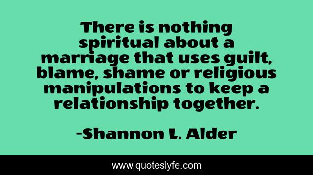 This page presents the quote "There is nothing spiritual about a marriage that uses guilt, blame, shame or religious manipulations to keep a relationship together.". Author of this quote is Shannon L. Alder. This quote is about guilt-trips, used, divorce, loveless, relationship-problems, loss-of-respect, blame, self-serving, manipulated,.