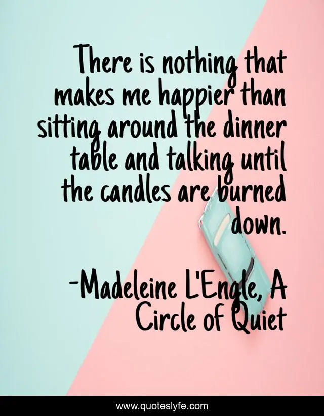This page presents the quote "There is nothing that makes me happier than sitting around the dinner table and talking until the candles are burned down.". Author of this quote is Madeleine L'Engle, A Circle of Quiet. This quote is about conversation, dinner, happiness, hospitality,.