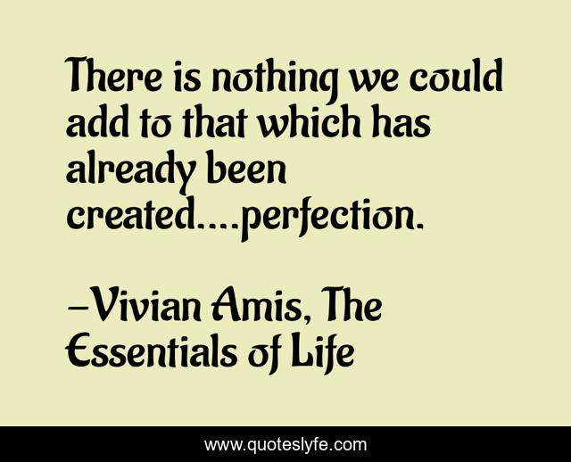 This page presents the quote "There is nothing we could add to that which has already been created....perfection.". Author of this quote is Vivian Amis, The Essentials of Life. This quote is about god, self, awakening, nirvana, doer, healing, oneness, enlightenment, insights,.