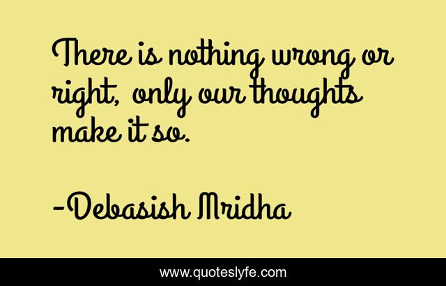 This page presents the quote "There is nothing wrong or right, only our thoughts make it so.". Author of this quote is Debasish Mridha. This quote is about power-of-thoughts, philosophy, debasish-mridha, wrong-or-right, quotes, inspirational, enthusiasm, debasish-mridha-m-d, thoughts,.
