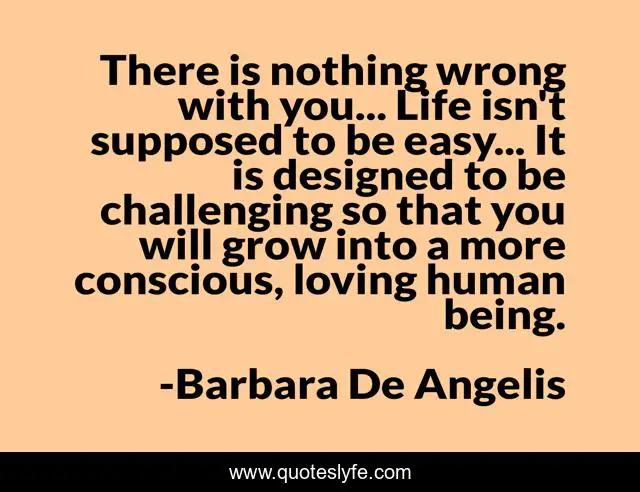 This page presents the quote "There is nothing wrong with you... Life isn't supposed to be easy... It is designed to be challenging so that you will grow into a more conscious, loving human being.". Author of this quote is Barbara De Angelis. This quote is about nothing-wrong, consciousness, life, human, loving,.
