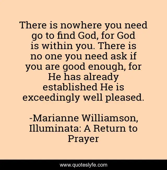 This page presents the quote "There is nowhere you need go to find God, for God is within you. There is no one you need ask if you are good enough, for He has already established He is exceedingly well pleased.". Author of this quote is Marianne Williamson, Illuminata: A Return to Prayer. This quote is about spirituality, self-worth,.