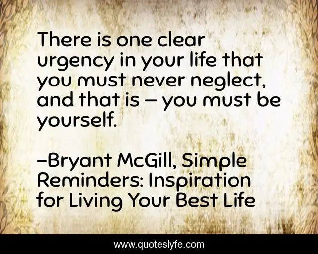 This page presents the quote "There is one clear urgency in your life that you must never neglect, and that is — you must be yourself.". Author of this quote is Bryant McGill, Simple Reminders: Inspiration for Living Your Best Life. This quote is about being, life, neglect, urgency,.