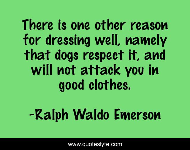 This page presents the quote "There is one other reason for dressing well, namely that dogs respect it, and will not attack you in good clothes.". Author of this quote is Ralph Waldo Emerson. This quote is about respect, fashion, humor, dogs,.