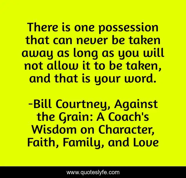 This page presents the quote "There is one possession that can never be taken away as long as you will not allow it to be taken, and that is your word.". Author of this quote is Bill Courtney, Against the Grain: A Coach's Wisdom on Character, Faith, Family, and Love. This quote is about possession, faith, word, inspire, away, allow, taken, believe,.