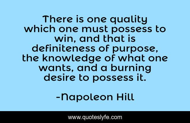This page presents the quote "There is one quality which one must possess to win, and that is definiteness of purpose, the knowledge of what one wants, and a burning desire to possess it.". Author of this quote is Napoleon Hill. This quote is about win, quality, purpose,.
