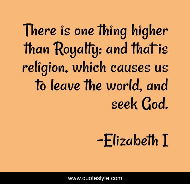 This page presents the quote "There is one thing higher than Royalty: and that is religion, which causes us to leave the world, and seek God.". Author of this quote is Elizabeth I. This quote is about god, royalty, world,.