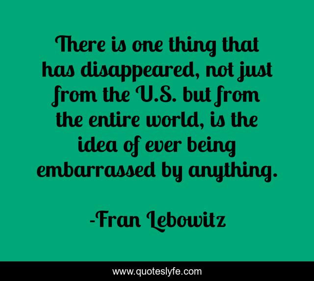 This page presents the quote "There is one thing that has disappeared, not just from the U.S. but from the entire world, is the idea of ever being embarrassed by anything.". Author of this quote is Fran Lebowitz. This quote is about embarrassed, embarrassment, society, united-states, world,.