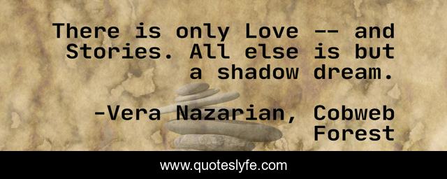 This page presents the quote "There is only Love -- and Stories. All else is but a shadow dream.". Author of this quote is Vera Nazarian, Cobweb Forest. This quote is about shadows, life, love, storytelling, being, story, stories, dreams, existence,.