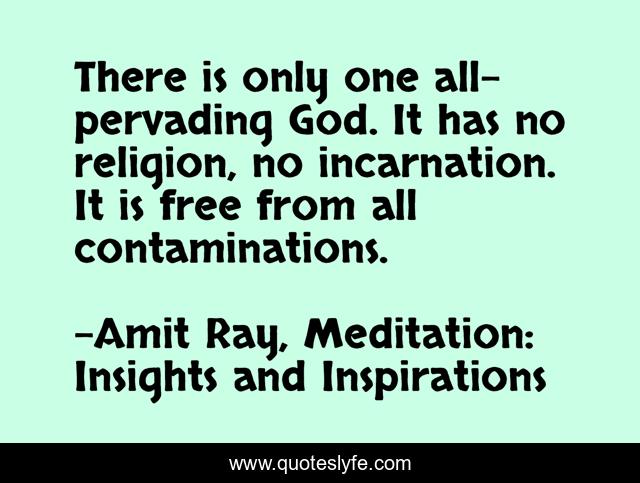 This page presents the quote "There is only one all-pervading God. It has no religion, no incarnation. It is free from all contaminations.". Author of this quote is Amit Ray, Meditation: Insights and Inspirations. This quote is about god, incarnation, religion,.