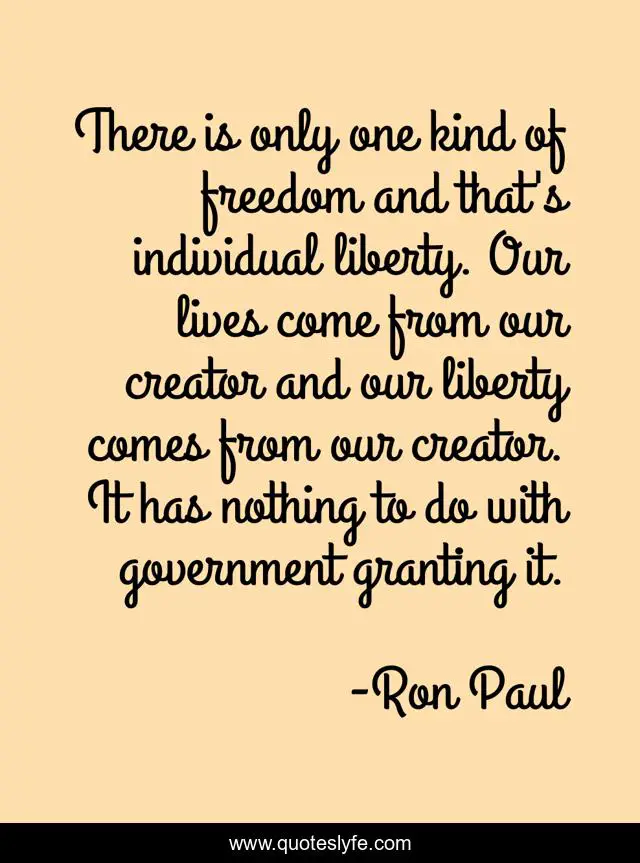 This page presents the quote "There is only one kind of freedom and that's individual liberty. Our lives come from our creator and our liberty comes from our creator. It has nothing to do with government granting it.". Author of this quote is Ron Paul. This quote is about freedom, kind, liberty,.