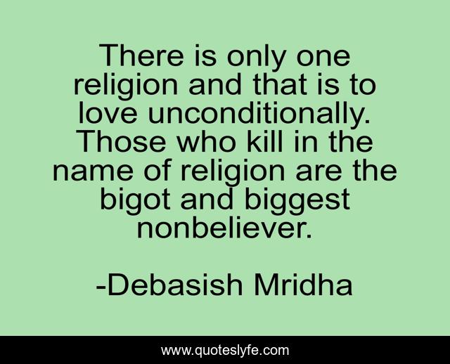 This page presents the quote "There is only one religion and that is to love unconditionally. Those who kill in the name of religion are the bigot and biggest nonbeliever.". Author of this quote is Debasish Mridha. This quote is about life, love, knowledge, inspirational, intelligence, philosophy, wisdom, quotes, affection,.