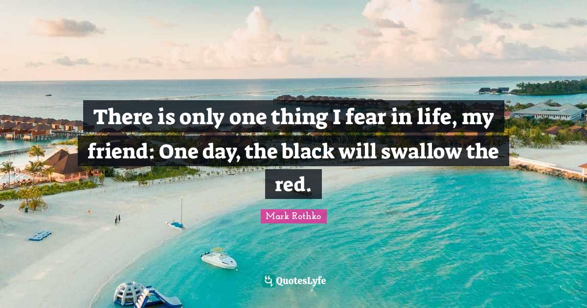 This page presents the quote "There is only one thing I fear in life, my friend: One day, the black will swallow the red.". Author of this quote is Mark Rothko. This quote is about red, life, black, one day, one thing, fear,.