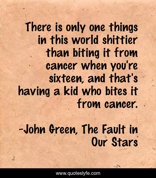 This page presents the quote "There is only one things in this world shittier than biting it from cancer when you're sixteen, and that's having a kid who bites it from cancer.". Author of this quote is John Green, The Fault in Our Stars. This quote is about death-and-dying, cancer,.