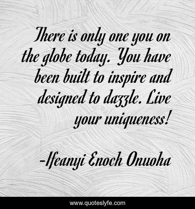 This page presents the quote "There is only one you on the globe today. You have been built to inspire and designed to dazzle. Live your uniqueness!". Author of this quote is Ifeanyi Enoch Onuoha. This quote is about godipulation, motivation, brand, ifeanyi-enoch-onuoha, godipulated, uniqueness, globe, inspiration,.