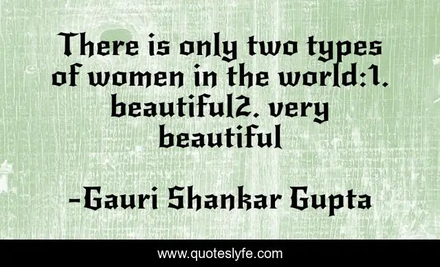 This page presents the quote "There is only two types of women in the world:1. beautiful2. very beautiful". Author of this quote is Gauri Shankar Gupta. This quote is about beauty, women,.