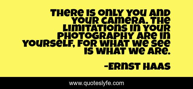This page presents the quote "There is only you and your camera. The limitations in your photography are in yourself, for what we see is what we are.". Author of this quote is Ernst Haas. This quote is about photography, camera, creativity,.