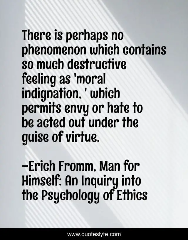 This page presents the quote "There is perhaps no phenomenon which contains so much destructive feeling as 'moral indignation, ' which permits envy or hate to be acted out under the guise of virtue.". Author of this quote is Erich Fromm, Man for Himself: An Inquiry into the Psychology of Ethics. This quote is about envy, vice, dishonesty, virtue, double-standards, hate, indignation, morality,.