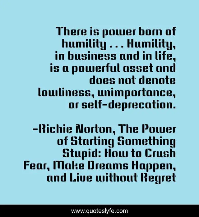 This page presents the quote "There is power born of humility . . . Humility, in business and in life, is a powerful asset and does not denote lowliness, unimportance, or self-deprecation.". Author of this quote is Richie Norton, The Power of Starting Something Stupid: How to Crush Fear, Make Dreams Happen, and Live without Regret. This quote is about life, unimportance, business, power, humility, powerful, lowliness, asset, self-deprecation,.