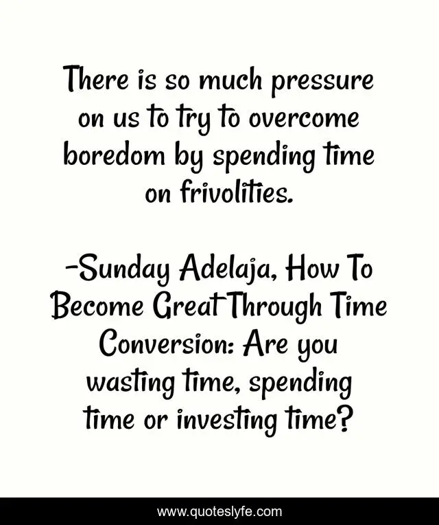 This page presents the quote "There is so much pressure on us to try to overcome boredom by spending time on frivolities.". Author of this quote is Sunday Adelaja, How To Become Great Through Time Conversion: Are you wasting time, spending time or investing time?. This quote is about life, conversion, productivity, wealth, frivolity, greatness, overcoming-boredom, waste, humanity,.