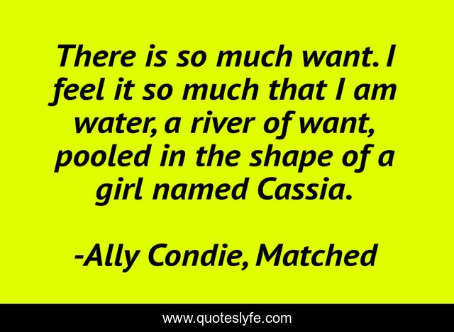 This page presents the quote "There is so much want. I feel it so much that I am water, a river of want, pooled in the shape of a girl named Cassia.". Author of this quote is Ally Condie, Matched. This quote is about metaphor, poetry,.