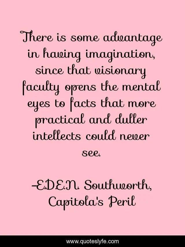 This page presents the quote "There is some advantage in having imagination, since that visionary faculty opens the mental eyes to facts that more practical and duller intellects could never see.". Author of this quote is E.D.E.N. Southworth, Capitola's Peril. This quote is about imagination, visionary, wisdom,.