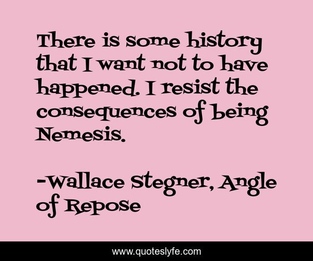 This page presents the quote "There is some history that I want not to have happened. I resist the consequences of being Nemesis.". Author of this quote is Wallace Stegner, Angle of Repose. This quote is about consequences, choices, destiny, fate, history,.