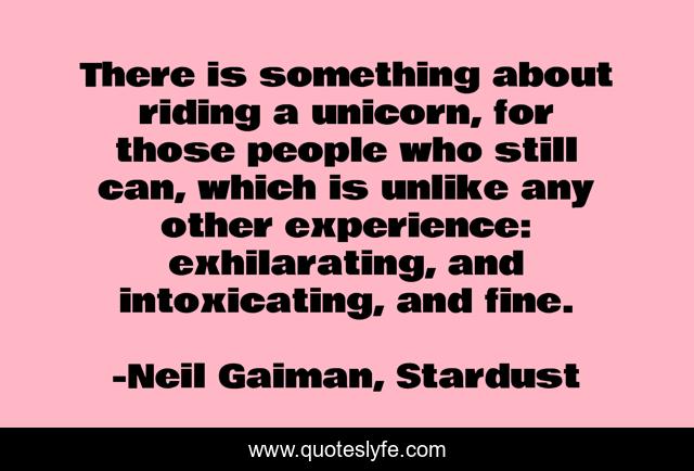 This page presents the quote "There is something about riding a unicorn, for those people who still can, which is unlike any other experience: exhilarating, and intoxicating, and fine.". Author of this quote is Neil Gaiman, Stardust. This quote is about stardust, mythical-beasts, fantasy-fiction,.
