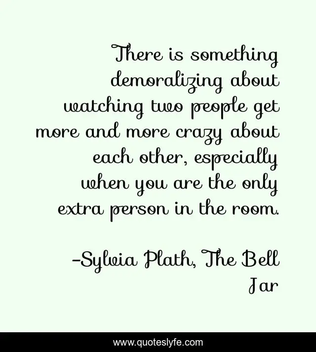 This page presents the quote "There is something demoralizing about watching two people get more and more crazy about each other, especially when you are the only extra person in the room.". Author of this quote is Sylvia Plath, The Bell Jar. This quote is about bell-jar, depression,.
