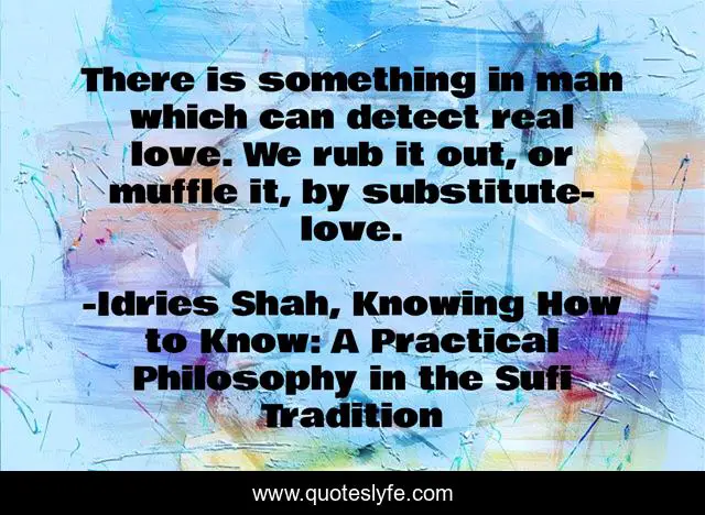 This page presents the quote "There is something in man which can detect real love. We rub it out, or muffle it, by substitute-love.". Author of this quote is Idries Shah, Knowing How to Know: A Practical Philosophy in the Sufi Tradition. This quote is about love, psychology, sufism, sufis, humanity, affection,.