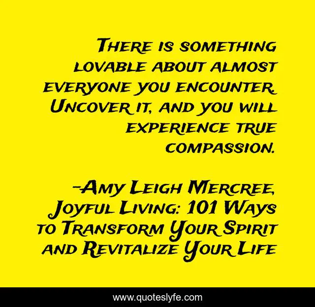 This page presents the quote "There is something lovable about almost everyone you encounter. Uncover it, and you will experience true compassion.". Author of this quote is Amy Leigh Mercree, Joyful Living: 101 Ways to Transform Your Spirit and Revitalize Your Life. This quote is about life, quotes-de-la-vida, amy-leigh-mercree, compassion, quote-of-the-day, quotes-on-compassion, joyful-living, quotes-tumblr, joyful-living-101,.