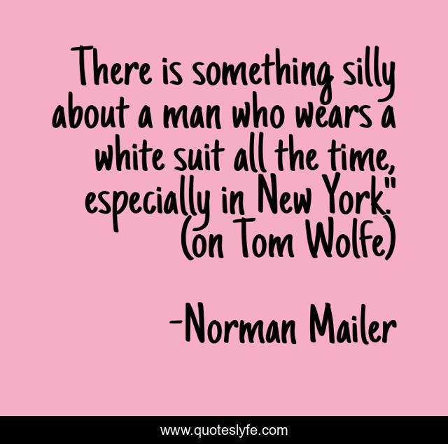 This page presents the quote "There is something silly about a man who wears a white suit all the time, especially in New York." (on Tom Wolfe)". Author of this quote is Norman Mailer. This quote is about authors, insults,.