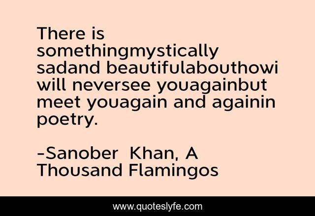 This page presents the quote "There is somethingmystically sadand beautifulabouthowi will neversee youagainbut meet youagain and againin poetry.". Author of this quote is Sanober Khan, A Thousand Flamingos. This quote is about beautiful, missing-you, poets, lovers, love, beauty, profound, indian-authors, poetry,.