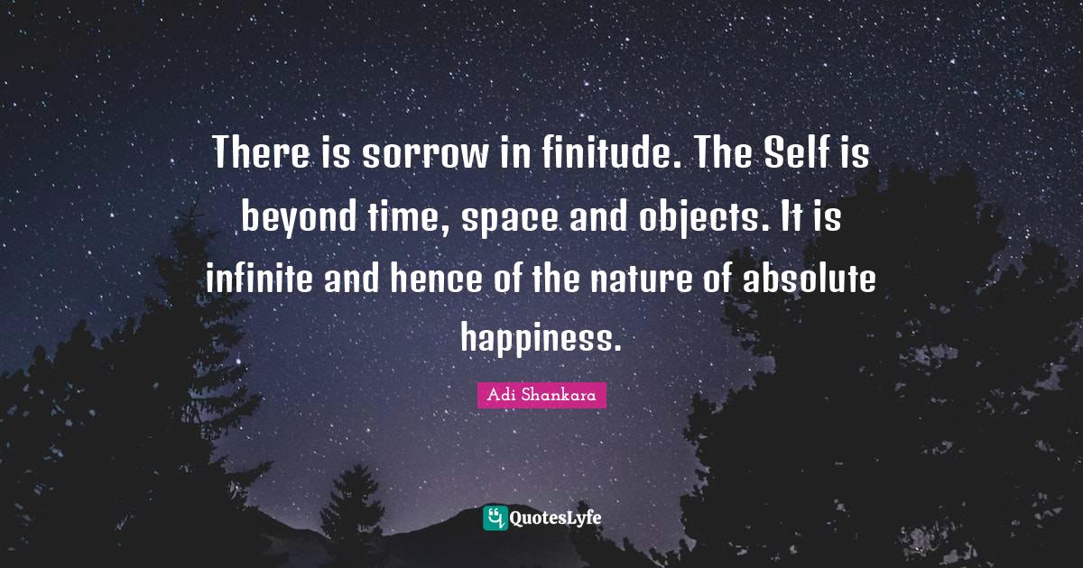 This page presents the quote "There is sorrow in finitude. The Self is beyond time, space and objects. It is infinite and hence of the nature of absolute happiness.". Author of this quote is Adi Shankara. This quote is about time, sorrow, self, objects, space, infinite, nature, happiness,.