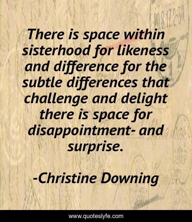 This page presents the quote "There is space within sisterhood for likeness and difference for the subtle differences that challenge and delight there is space for disappointment- and surprise.". Author of this quote is Christine Downing. This quote is about control, self,.