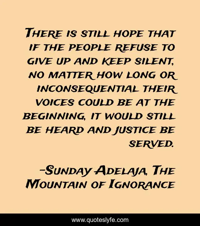 This page presents the quote "There is still hope that if the people refuse to give up and keep silent, no matter how long or inconsequential their voices could be at the beginning, it would still be heard and justice be served.". Author of this quote is Sunday Adelaja, The Mountain of Ignorance. This quote is about mountain, life, darkness, power, danger, speak-out, god, refusal, people,.