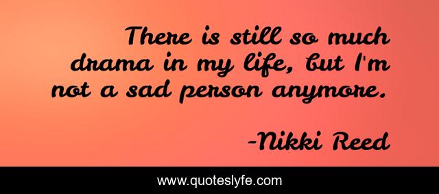 This page presents the quote "There is still so much drama in my life, but I'm not a sad person anymore.". Author of this quote is Nikki Reed. This quote is about drama, life, my life,.