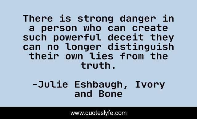 This page presents the quote "There is strong danger in a person who can create such powerful deceit they can no longer distinguish their own lies from the truth.". Author of this quote is Julie Eshbaugh, Ivory and Bone. This quote is about deceit, lies,.