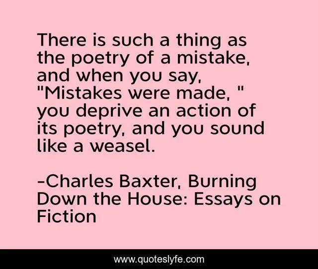 This page presents the quote "There is such a thing as the poetry of a mistake, and when you say, "Mistakes were made, " you deprive an action of its poetry, and you sound like a weasel.". Author of this quote is Charles Baxter, Burning Down the House: Essays on Fiction. This quote is about character, villainy, deniability, mistakes, politics, passive-voice,.
