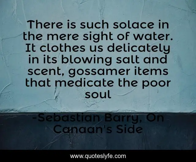 This page presents the quote "There is such solace in the mere sight of water. It clothes us delicately in its blowing salt and scent, gossamer items that medicate the poor soul". Author of this quote is Sebastian Barry, On Canaan's Side. This quote is about water, solace,.