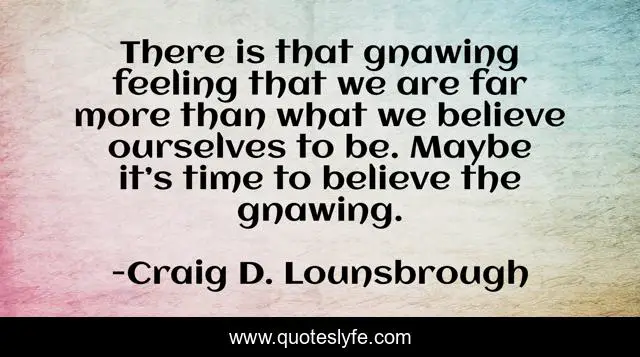 This page presents the quote "There is that gnawing feeling that we are far more than what we believe ourselves to be. Maybe it’s time to believe the gnawing.". Author of this quote is Craig D. Lounsbrough. This quote is about intuition, feeling, self-confidence, belief, intuitive, self, gnawing, possibilities, self-perception,.