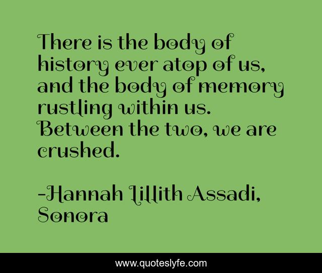 This page presents the quote "There is the body of history ever atop of us, and the body of memory rustling within us. Between the two, we are crushed.". Author of this quote is Hannah Lillith Assadi, Sonora. This quote is about metaphor, hannah-lillith-assadi, the-past, memory, sonora, history,.