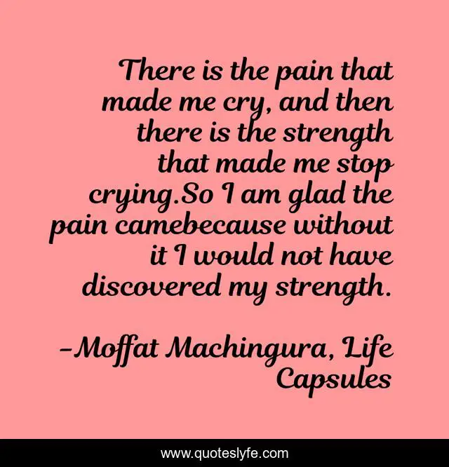 This page presents the quote "There is the pain that made me cry, and then there is the strength that made me stop crying.So I am glad the pain camebecause without it I would not have discovered my strength.". Author of this quote is Moffat Machingura, Life Capsules. This quote is about strength, pain, power, gladness, tears, crying, inner-strength,.