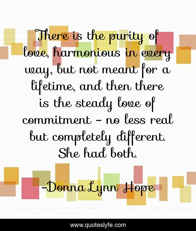This page presents the quote "There is the purity of love, harmonious in every way, but not meant for a lifetime, and then there is the steady love of commitment - no less real but completely different. She had both.". Author of this quote is Donna Lynn Hope. This quote is about relationships, love, commitment, romance, passion, harmony, affection,.