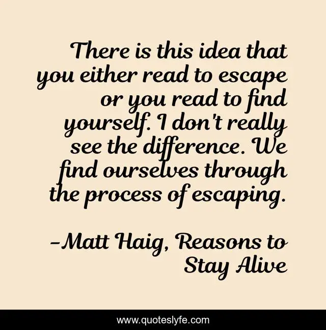 This page presents the quote "There is this idea that you either read to escape or you read to find yourself. I don't really see the difference. We find ourselves through the process of escaping.". Author of this quote is Matt Haig, Reasons to Stay Alive. .