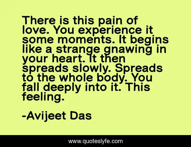This page presents the quote "There is this pain of love. You experience it some moments. It begins like a strange gnawing in your heart. It then spreads slowly. Spreads to the whole body. You fall deeply into it. This feeling.". Author of this quote is Avijeet Das. This quote is about love, love-and-sayings, valentines, poetry, muse, love-poem, love-story, pain-of-love, affection,.