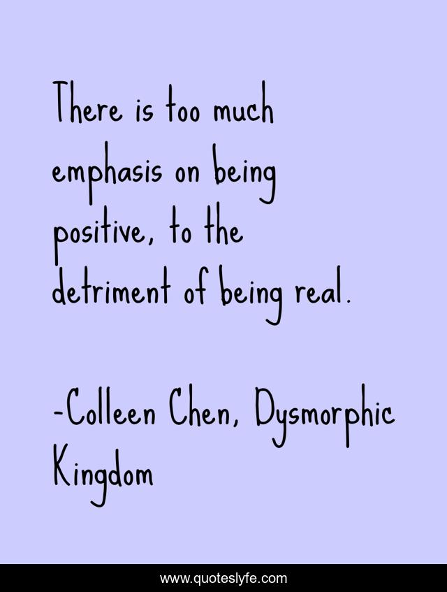 This page presents the quote "There is too much emphasis on being positive, to the detriment of being real.". Author of this quote is Colleen Chen, Dysmorphic Kingdom. This quote is about thinking, positive, confidence, thinking-positively, reality,.
