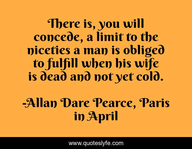 This page presents the quote "There is, you will concede, a limit to the niceties a man is obliged to fulfill when his wife is dead and not yet cold.". Author of this quote is Allan Dare Pearce, Paris in April. This quote is about wife-and-husband, death, death-of-a-loved-one, wife,.