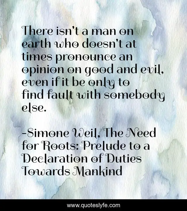 This page presents the quote "There isn't a man on earth who doesn't at times pronounce an opinion on good and evil, even if it be only to find fault with somebody else.". Author of this quote is Simone Weil, The Need for Roots: Prelude to a Declaration of Duties Towards Mankind. .