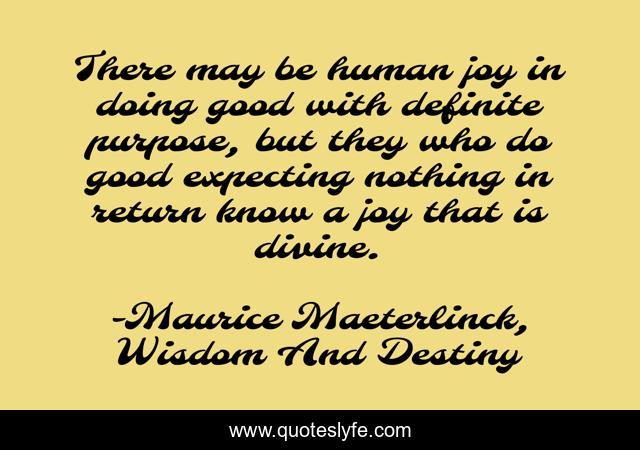 This page presents the quote "There may be human joy in doing good with definite purpose, but they who do good expecting nothing in return know a joy that is divine.". Author of this quote is Maurice Maeterlinck, Wisdom And Destiny. This quote is about joy, divine, no-expectations, wisdom,.